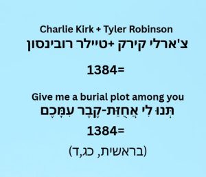 🕯️טיילר רובינסון + צ’ארלי קירק — שווה בדיוק למילים בגימטריה: תְּנוּ לִי אֲחֻזַּת-קֶבֶר עִמָּכֶם, וההמשך: אֶקְבְּרָה מֵתִי מִלְּפָנָי…..