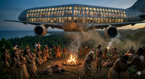 אולם ערב אחד, פתאום, בזמן שזקני הכפר קוששו אבנים ובני השבט התיישבו מסביב במעגל, עבר מעליהם מטוס.